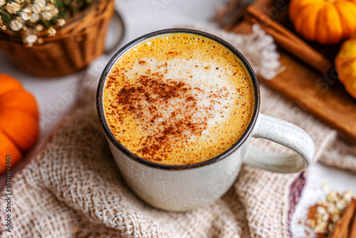 Sipping a delicious pumpkin and banana smoothie in a rustic mug surrounded by small pumpkins and autumn decor, perfect for a cozy afternoon in fall