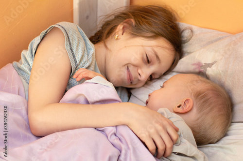 Sister and little brother baby are lying on the bed at home in the room and hugging fun. they look at each other