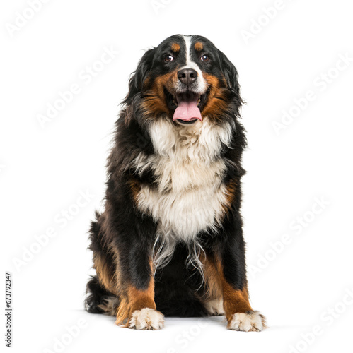 white background, cut-out, isolated on white, isolated, white, purebred dog, carnivore, mammal, pet, domestic, vertebrate, animal, studio, studio shot, nobody, no people, bernese mountain dog, one animal, sitting, tongue, mouth open, panting, dog