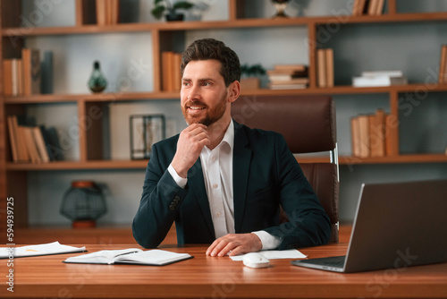 Sitting by table with laptop. Businessman in formal clothes is working indoors