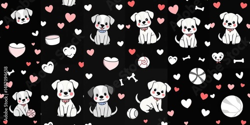 paw, seamless, vector, tail, canino, graphic, illustration, adorable, funny, doggy, bowl, black, dog, pattern, heart, background, ball, animal, bone, puppy, white, collar, doodle, design, repeat, accessory, pet, pet, cartoon, texture, cute