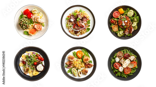 Six Assorted Healthy Meals on Plates, Overhead View, PNG