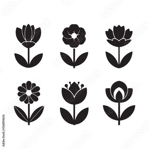 black, silhouette, flower, floral, icon, leaf, simple, stylised, botanical, vector, graphic, set, design element, illustration, minimalist, monochrome, flat, graphic design, pattern, texture, background, decoration, symbol, emblem, logotype, branding, art, nature, spring, summer, plant, blossom, bloom, white background, black-and-white