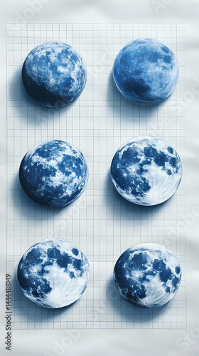 Six blue lunar spheres with rough textures arranged on a square grid surface with soft shadows