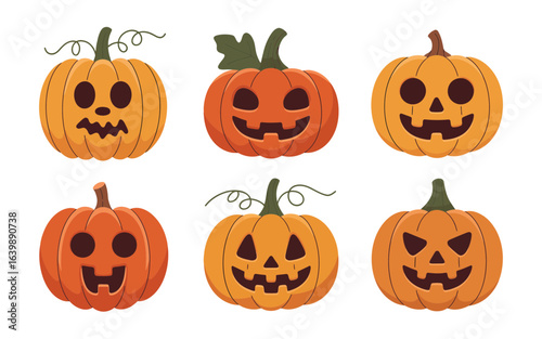 Six cartoon pumpkins with carved faces halloween orange