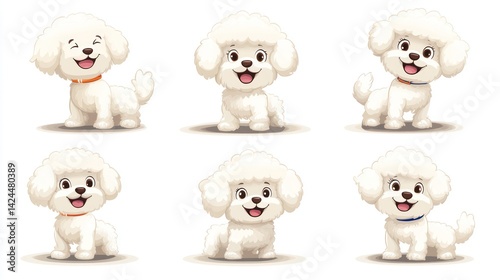 Six cute cartoon poodles; white background; playful; children's book illustration