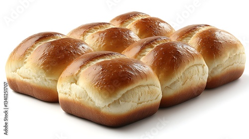 Six golden-brown dinner rolls, freshly baked, arranged on white background.