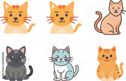 Six icon Collection of six cute cartoon cats in various colors and poses