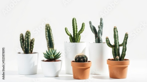 cactus, plant, pot, succulent, white, green, flora, botanical, nature, desert, container, botany, garden, home, decor, minimal, houseplant, interior, style, simple, growth, row, spiky, prickly, sharp, decorative, tabletop, collection, different, variety, shape, size, display, studio, still, life, indoor, minimalist, modern, arrangement, isolated, bright, background, ceramic, terracotta, sand, earthy, natural