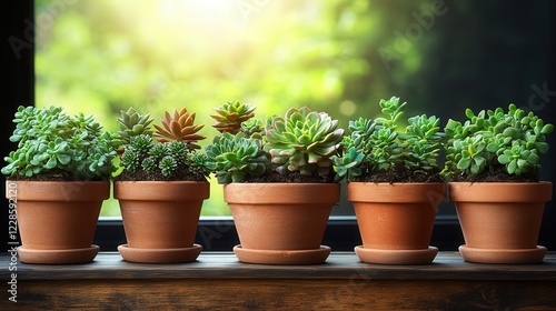 Six Terracotta Planters Filled with Vibrant Succulents Under Bright Sunlight Indoors
