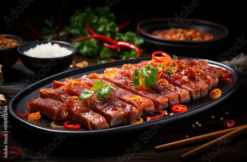 pork meat, belly, slice, citrous, garnish, chili, pepper, cilantro, asian, plate, black, savoury, sauce, glazed, succulent, food, dish, cookery, culinary, gastronomy, dinner, lunch, delicious, tasty, flavorful, spicey, zesty, crispy, tender, aromatic, fresh, epicure, dark, wooden, table, background