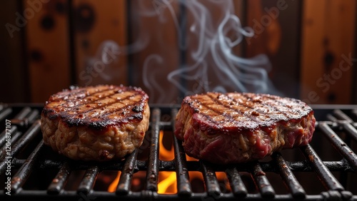 Sizzling burger patties grill outdoors against a fiery backdrop; their juicy, round forms glisten on a sleek black grill, emitting irresistible aromas