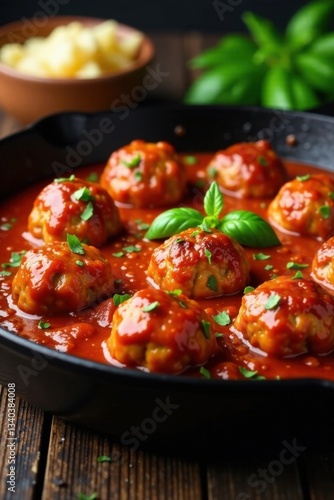 Sizzling meatballs in cast iron skillet with tomato sauce, meal, food