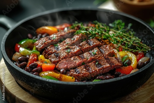 Sizzling steak fajitas with peppers, onions, and beans in a cast iron skillet