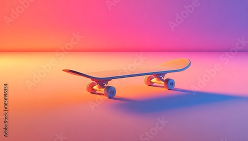 skateboard, skateboarding, neon, light, vibrant, colours, pink, purple, gradient, shadow, long, studio, lighting, minimalist, modern, sport, extreme, urban, culture, street, art, recreation, transportation, wheeled, deck, wheel, indoor, abstract