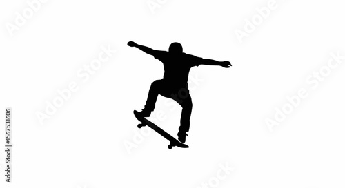 Skateboarder Performing Kickflip Trick Silhouette on White Background, Extreme Sports Action Vector Illustration