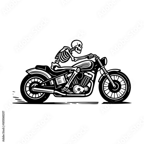 Skeleton riding motorcycle sketch engraving black and white outline. Scratch board imitation. illustrated in vintage line art style on a white background.