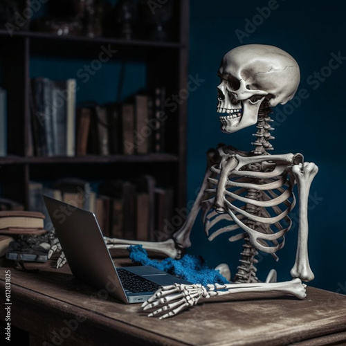 skeleton, computer, laptop, technology, halloween, dead, deadline, bone, using, desk, typing, white, web, human, skittish, device, scarey, cyberspace, skull, male, table, job, workplace, overdue, plastic, business, artificial, indoor, background, office, room, object, humor, concept, model, modern, old, tied-up, businessman, sitting, wooden, wearing, wall, suit, medicals, coat, ai