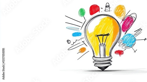 Sketch of a lightbulb with colorful crayon accents and radiating lines on a white background. The image evokes creativity and new ideas.