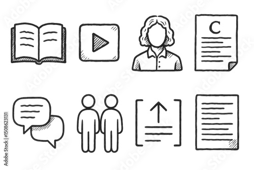 vignetting, style, icon, book, play, author, script, dialogue, character, stage, direction, text, black, hand, drawn, line, art, set, icon, isolated, transparent, draw, simple