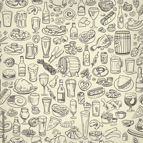 beer, glasses, vignetting, vector, mug, pint, drawing, drink, pub, ales, alcohol, graphic, bar, scribble, celebration, doodle, icon, collection, set, chicken, snack, food, sausage, peanut, pistachio, can, shrimp, wing, potato chips, hamburger, steak, pretzel, meat, olive, bottle, menu, lager, illustration, eatery, oktoberfest, bavaria, festival, pattern, seamless