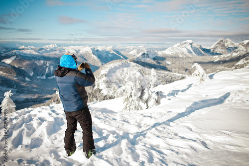 british columbia, canada, candid, day, digital camera, explorer, footprint, full-length, horizontal, landscape, mountain, mountain chain, nature reserve, one person, outdoors, photographing, scenic, shadow, snow, snow-capped, standing, travel, warm clothes, winter