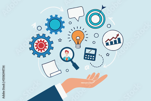 Skill, work experience or ability development, expertise success, leadership or communication to success, learning skills, wisdom concept, businessman hand hold multiple skills set to achieve success.