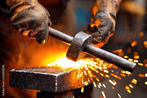 blacksmith, metalworking, forging, hammer, spark, heat, fire, tool, craft, skill, industry, steel, iron, work, hand, labor, artisan, energy, power, precision, manufacturing, process, production, quality, expertise, detail, focused, intense, glowing, flames, hot, workshop, industrial, craftsmanship, anvil