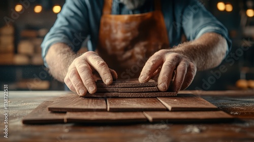 Skilled carpenter smoothing wood planks with sandpaper in a workshop environment