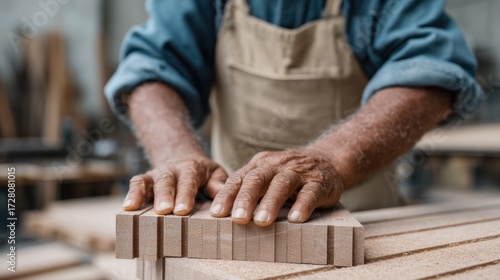 Skilled craftsman working on wooden pieces in a workshop, focusing on precision and craftsmanship with hands on the materials and tools in a rustic environment