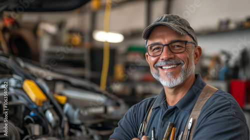 Skilled mechanic smiling in workshop, showcasing tools and expertise. His friendly demeanor reflects passion for automotive work and dedication to quality service