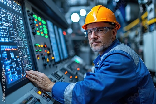 Skilled technician operating advanced control systems in a modern industrial environment during daytime