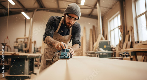 industry, business, craftsmanship, occupation, production, workshop, woodworker, carpenter, craftsman, artisan, man, beard, beanie, apron, wood, timber, timbering, plank, tool, equipment, machinery, working, planing, shaping, processing, creating, building, constructing, smoothing, sawdust, dust, skill, expertise, dedication, precision, sharpened, productivity, hard work, focused, industrious, diligent, realistic, authentic, indoor, warm light, bokeh