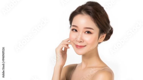 Skin care. Woman with beauty face touching healthy facial skin portrait. Beautiful smiling asian girl model with natural makeup touching glowing hydrated skin on white background closeup