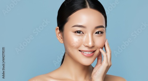 Skin care. Woman with beauty face touching healthy facial skin portrait. Beautiful smiling asian girl with blue background