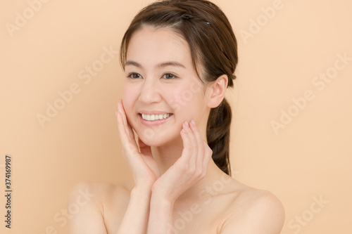 skincare, woman, young, middle-aged, 30s, cosmetic, beauty, skin, este, massage, face, people, winter, fall, beige, nudity, naked, japanese, asian, smile, dryness, pretty, clean, joyful, rejoice, decollete, satisfaction, girl, hand