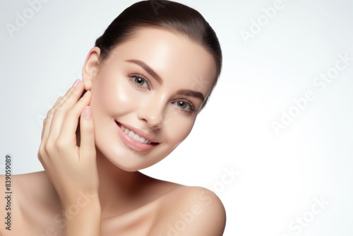 adult, background, beauty product, beauty treatment, bodycare, body part, cheek, cheerful, chin, clean, close, closeup, copy space, copy space, eyebrow, eyelash, eyes closed, face, fashion, female, forehead, front view, glamour, coiffure, hand, happiness, happy, head, head shot, health spa, human, human face, human hair, human head, human lips, human skin, isolate, light, lipstick, long hair, constructed, make-up, natural, neck, nose, one person, perfection, person