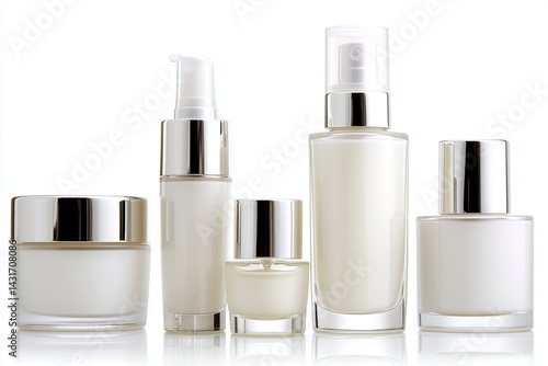 Skincare products including moisturizer, serum, and treatment displayed in a neat arrangement on a white background