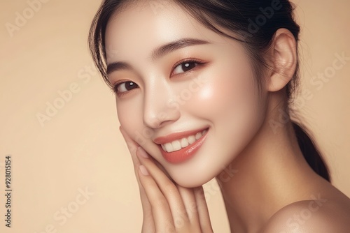 Skincare. Woman with beautiful face touching healthy facial skin portrait. Beautiful smiling Asian girl model with natural makeup enjoys glowing hydrated skin on beige with generative ai