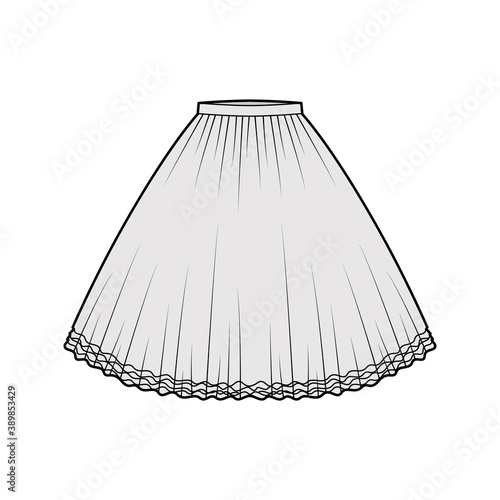 Skirt tutu crinoline technical fashion illustration with knee silhouette, circular fullness, thin waistband. Flat bottom template front, grey color style. Women, men, unisex CAD mockup