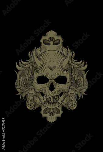 illustration, art, skull, head, tattoo, graphic, design, artwork, symbol, drawing, vector, evil, face, black, death, horn, vintage, daemon, decoration, background, skeleton, halloween, devil, dead, style, bone, print, horror, logotype, monster, isolated, ornament, animal, culture, gothic, dark, ornamental, mask, retro, element, scarey, pattern, vignetting, t-shirt, wild, japanese, white, mascot, samurai