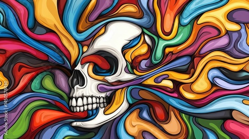 Skull engulfed in vibrant, swirling abstract forms.