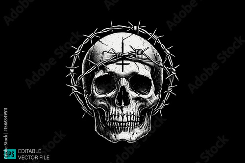 Skull head with fence dark art scary creepy style tattoo illustration vector black and white background templates