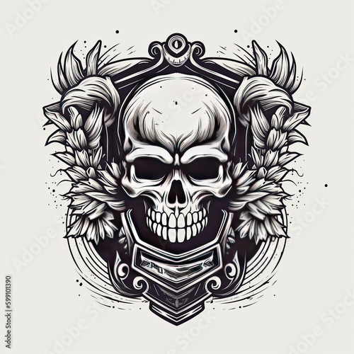 skull, logotype, emblem, black-and-white, banner, illustration, crest, graphic, design, death, mortality, power, strength, darkness, evil, gothic, punk, rock, tattoo, art, artistic, creativity, expression, decorative, ornamental, pattern, print, branding, marketing, business, identity, skeleton, bone, anatomy, horror, mystery, surreal, mystical, occult, symbolism, danger, warning, rebellion, generative, ai