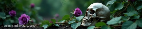Skull resting on a purple rose amidst overgrown vines, greenery, foliage, tropical
