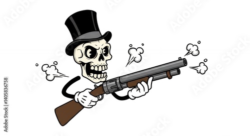 skull, cartoon, illustration, graphic, vintage, retro, comic, silk hat, shotgun, firing, action, dynamic, graphic design, poster, sticker, web graphics, background