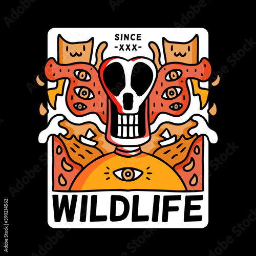 Skull, two little cat, and eyes with wildlife typography, illustration with hipster style. Vector graphics for t-shirt prints and other uses.