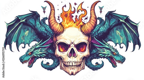 Skull with fire, horns, and dragon heads. Illustration for fantasy, games, prints, posters