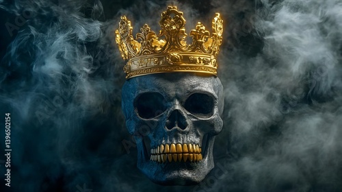 Skull with Golden Crown on Dark Misty Background for Dramatic Effects