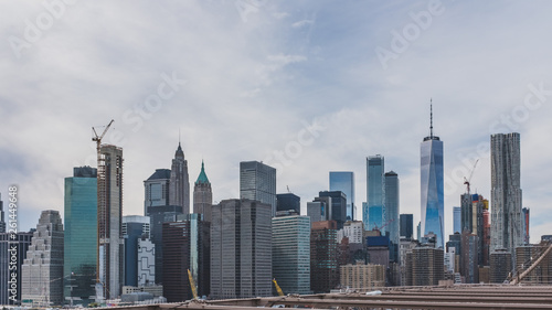 Skyscrapers of downtown Manhattan under clouds and sky viewed from Brooklyn Bridge Park, in Brooklyn, New York, USA